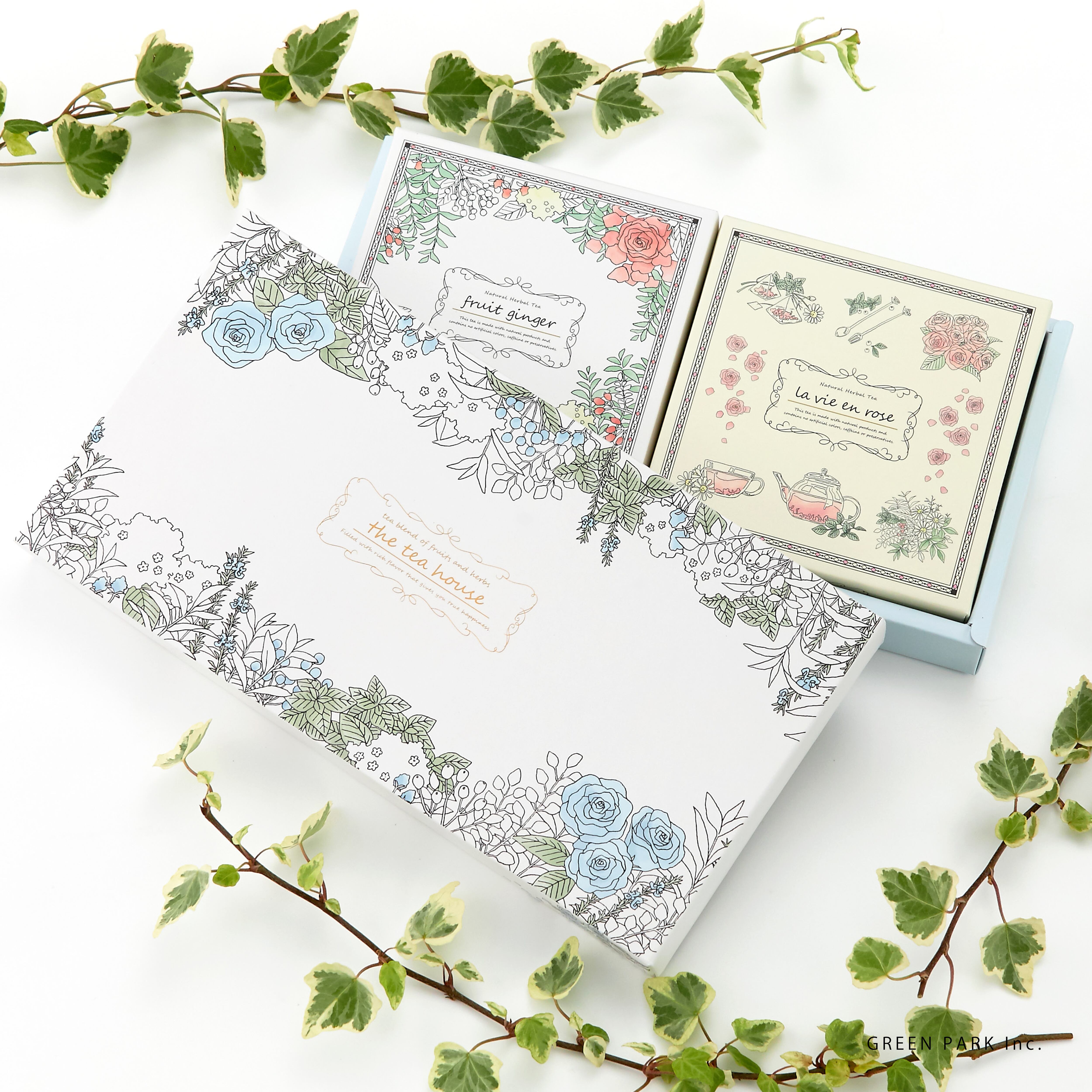 グリーンパークオリジナルのボタニカルモチーフのギフトボックスにセットしました。